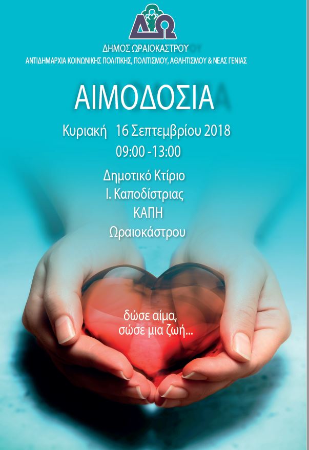Δώσε αίμα, σώσε μια ζωή! Μ΄αυτό το σύνθημα ο δήμος Ωραιοκάστρου και η αντιδημαρχία Κοινωνικής Πολιτικής, την Κυριακή 16 Σεπτεμβρίου, διοργανώνουν ημέρα αιμοδοσίας.
