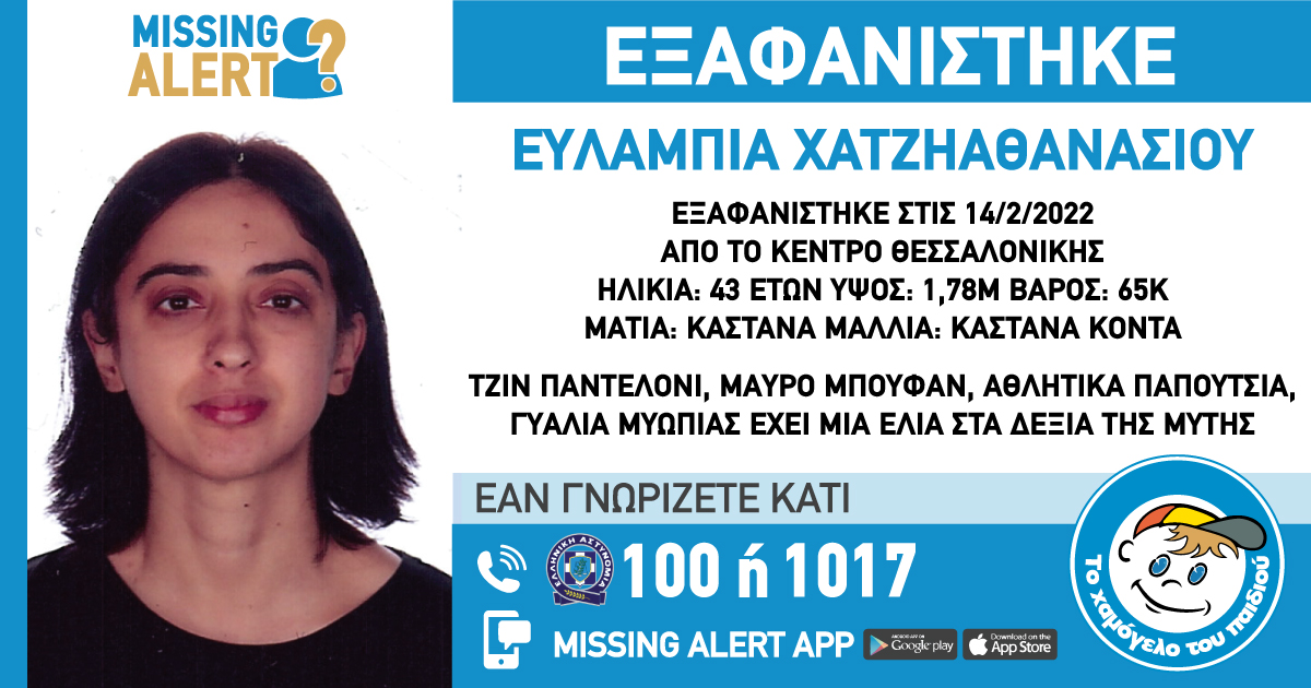 Συναγερμός έχει σημάνει στις Αρχές για την εξαφάνιση 43χρονης στη Θεσσαλονίκη. Πρόκειται για την Ευλαμπία Χατζηαθανασίου, τα ίχνη της οποίας χάθηκαν στις 14 Φεβρουαρίου από την περιοχή του Κέντρου της Θεσσαλονίκης.