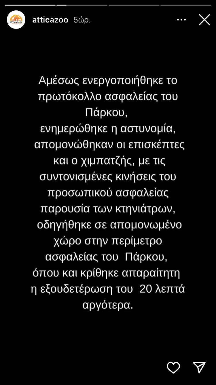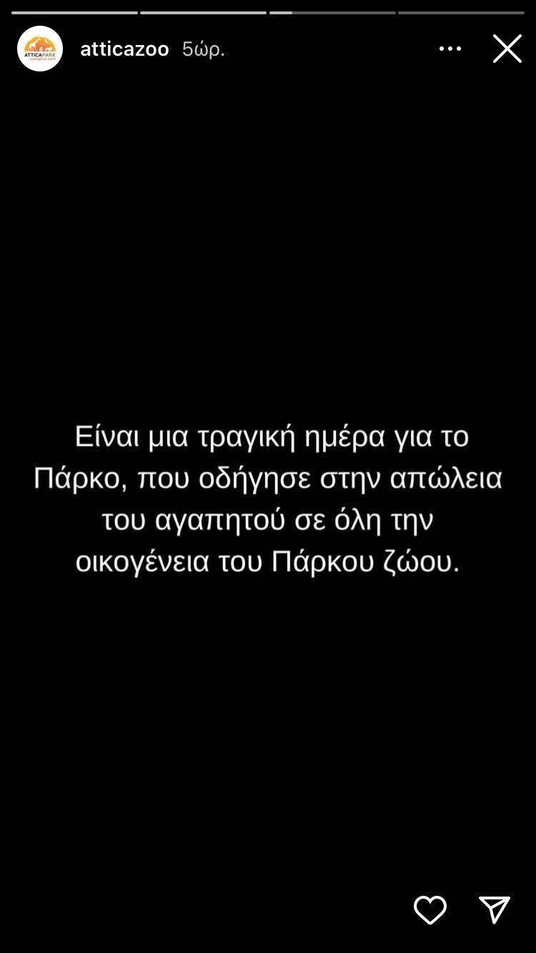 Την είδηση έκανε γνωστό το Αττικό Ζωολογικό Πάρκο με stories στο Instagram, όπου και αναφέρει τις λεπτομέρειες του τραγικού αυτού περιστατικού. Συγκεκριμένα, στην ανακοίνωση του με stories στο instagram αναφέρεται: