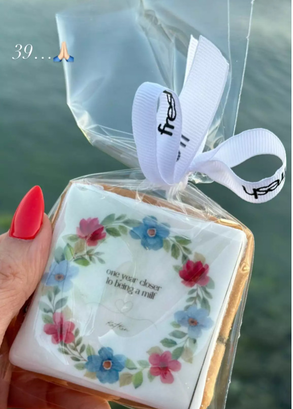 Η ίδια αναδημοσίευσε τα στιγμιότυπα στον προσωπικό της λογαριασμό στο Instagram. Σε ένα από αυτά τη βλέπουμε να ποζάρει με τον Χάρη Λεμπιδάκη πιο λαμπερή από ποτέ φορώντας ένα μπλε φόρεμα, ενώ σε κάποια άλλα στιγμιότυπα βλέπουμε τα ιδιαίτερα δωράκια στους καλεσμένους της τα οποία γράφουν χιουμοριστικά «Ένα χρόνο πιο κοντά στο να γίνω milf».